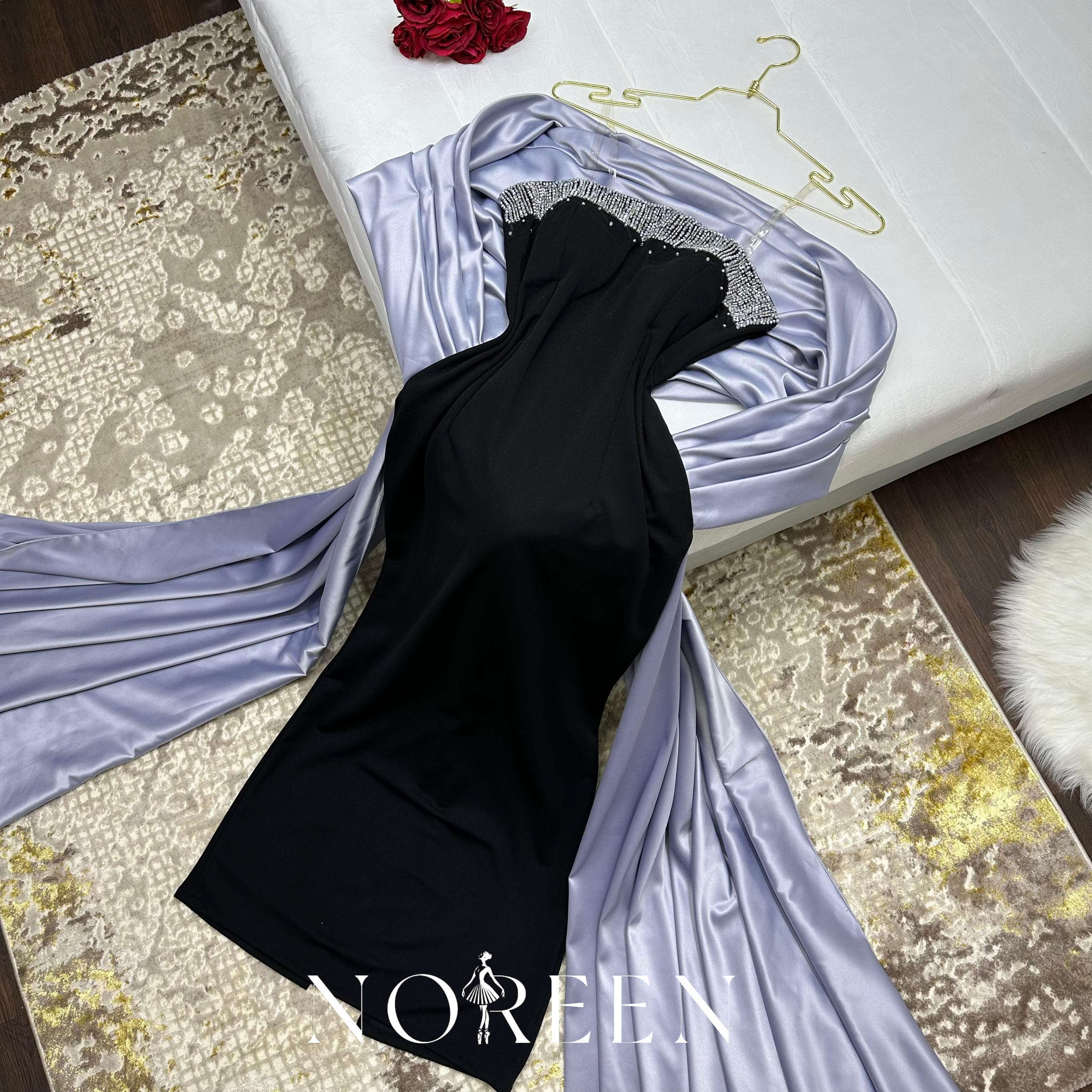 - اللون: الفستان أسود، مع شال باللون الرمادي الفاتح، مما يخلق تباينًا جميلًا.