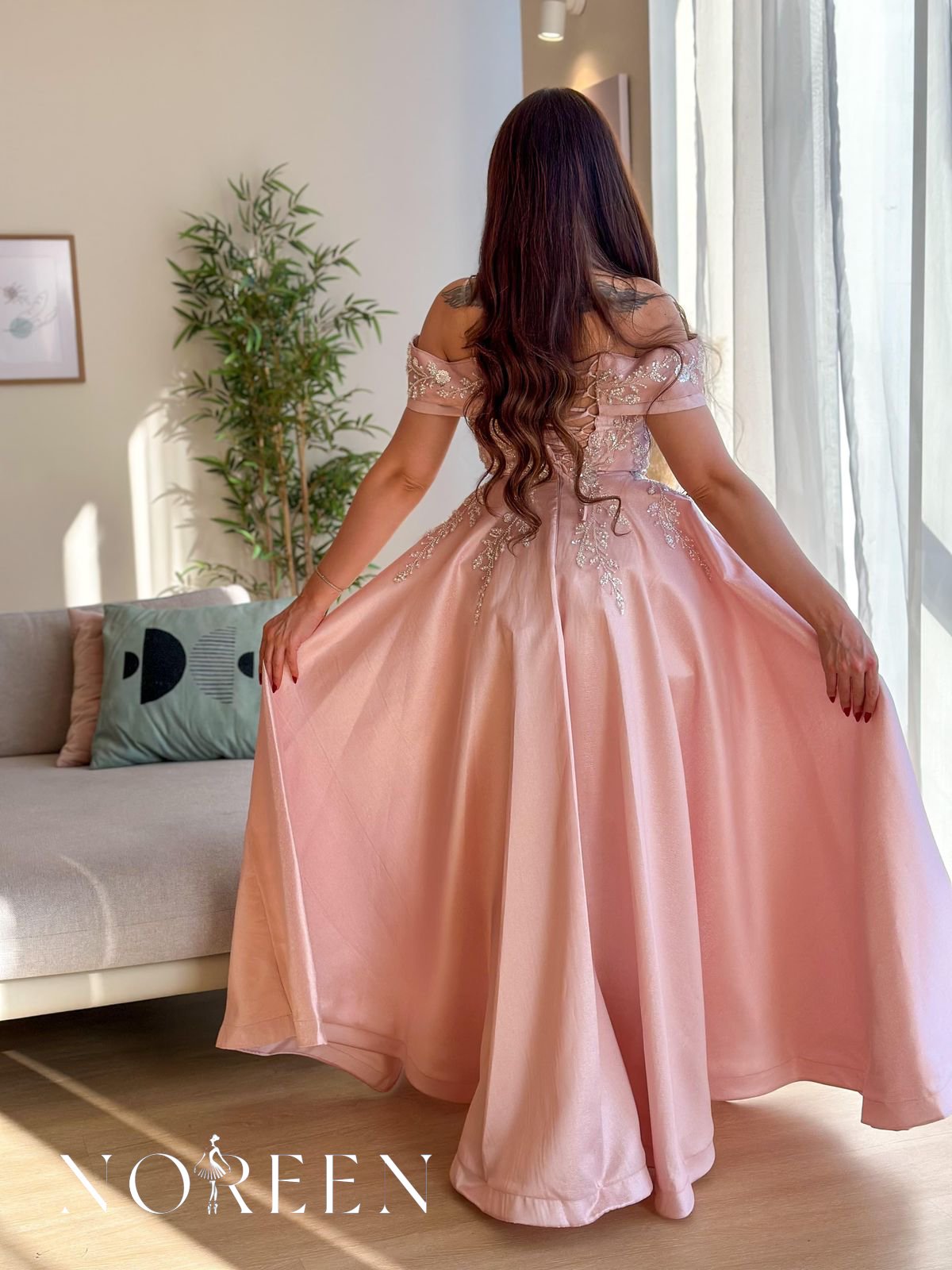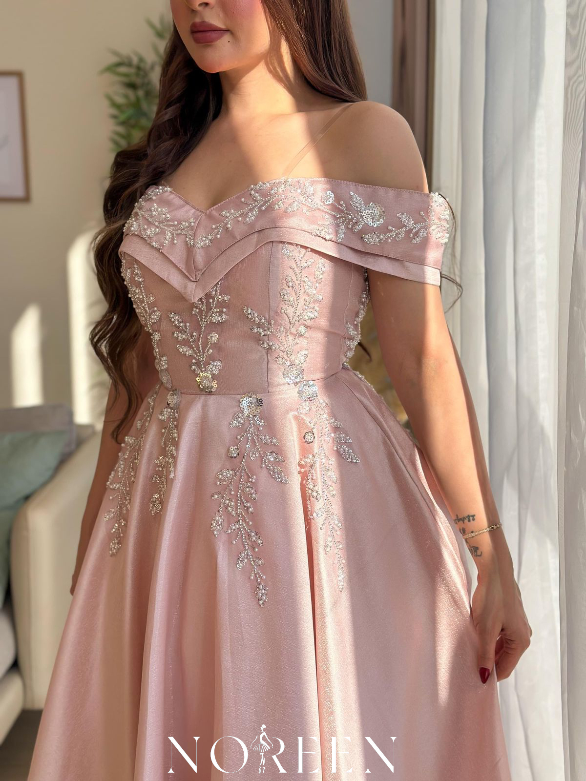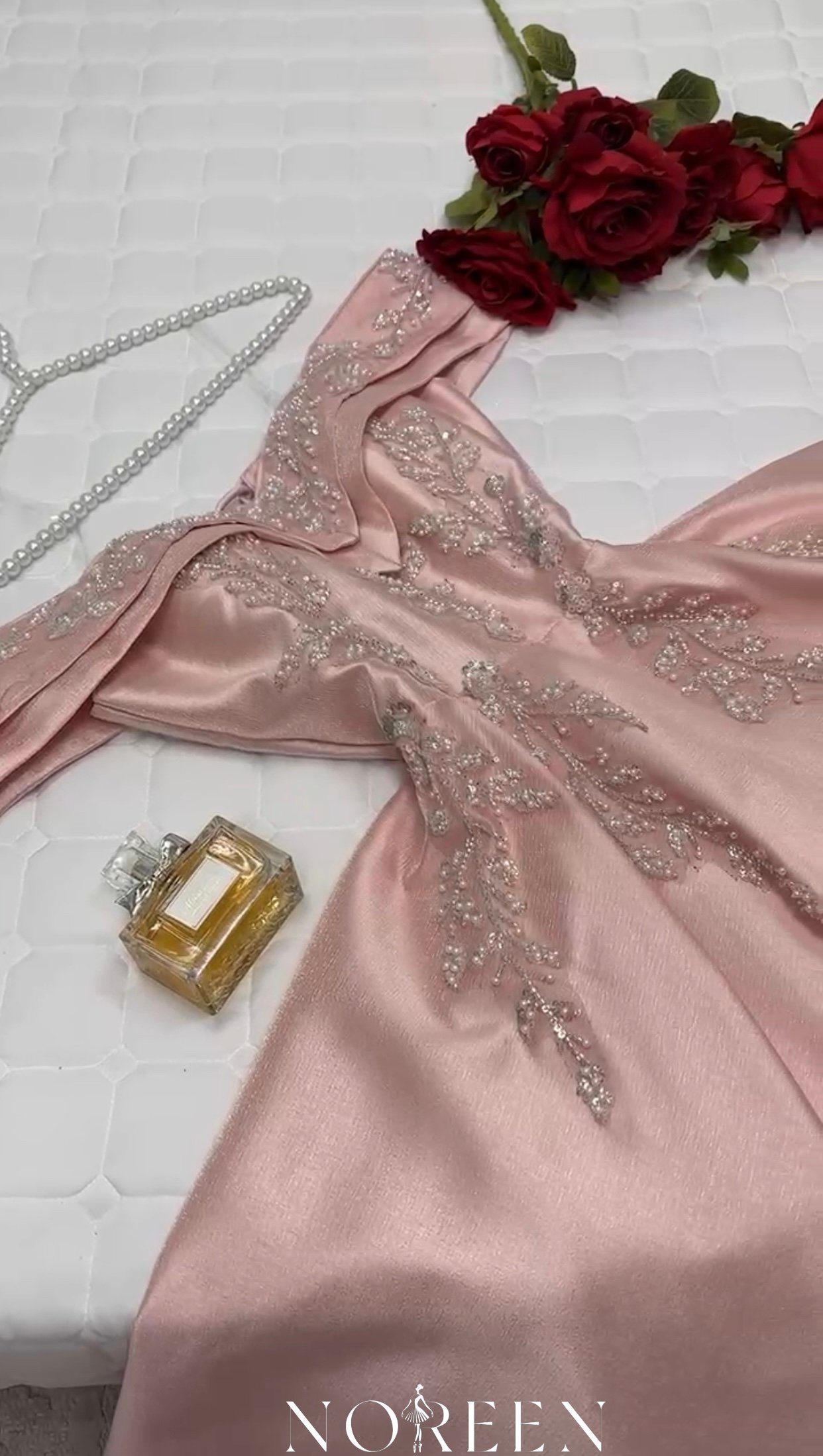 - يأتي الفستان بلون وردي ناعم، مثالي لإطلالة رومانسية وأنيقة.